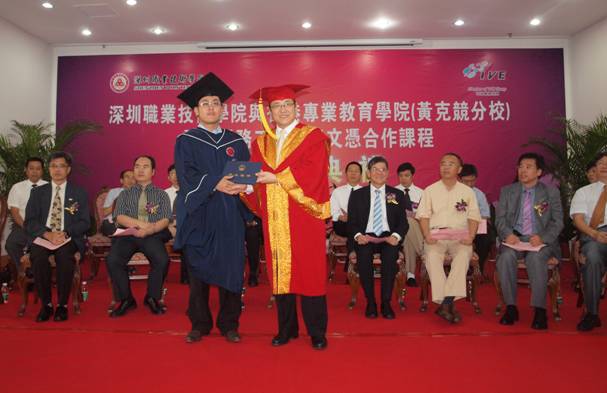 毕业典礼由机电工程学院院长冯小军教授主持, 2012届深港电气服务工程高级文凭合作课程的25名毕业生、部分在校学生以及毕业生家长参加了典礼。毕业典礼开始,全体肃立,奏唱国歌;接着,杨润辉副校长代表学校致辞,向毕业生同学们表示热烈祝贺,他说:我们合作双方为了培养出合格的、高质量的人才,付出了大量的辛苦努力——香港的老师们不知道有多少次往返港深两地,为此耗费了大量的心血,可以说是殚精竭虑;我校机电学院的老师们在课程开发、课堂教学、技能训练等方面不断进行频繁沟通,反复对教学文件进行讨论、修改、完善,可以说是呕心沥血。通过共同努力,双方的首次合作取得了圆满的成果。在回顾了我校与香港方面交流合作的历史后,他提出了与香港职业训练局、香港专业教育学院深化合作的五点设想:1、继续合作开发与国际接轨的职业教育课程,或者共建专业和课程,共同开发教学软件;2、开展职业培训项目合作;3、联合开展国际职业资格证书培训、考试和鉴定;4、探索学分和学历证书互认; 5、双方院校的师生增加互派互换交流等等。杨副校长最后希望毕业生同学作为深港联合培养的人才,发挥自己的独特优势,努力为社会做出更大的贡献。