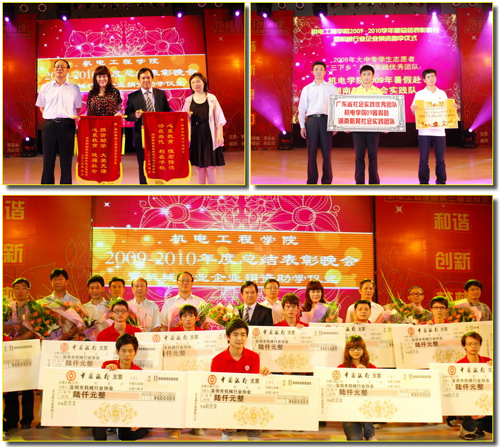 6月3日晚,机电学院2009-2010学年度总结表彰晚会暨深圳机械行业协会捐资助学仪式在东校区体育馆隆重举行。本场晚会也是机电学院第三届班级文化建设汇演暨第六届机电技能节闭幕晚会。学校刘洪一校长、陈秋明副校长出席晚会。到会的嘉宾还有深圳机械行业协会会长、亿和精密工业控股有限公司总裁张耀华,深圳机械行业协会秘书长黄少萍、副秘书长王达滨,深圳红今品牌营销有限公司执行董事赵家伟,精森源模具(深圳)有限公司总经理黄志强,立扬数控设备(合肥)有限公司副总经理宋伟、深圳办事处总经理彭永毅,日启亚机电(深圳)有限公司副董事长兼副总经理唐建伟,深圳市广恒钢实业有限公司总经理姚纪广,深圳市捷甬达实业有限公司董事长兼总经理周勇,深圳市平进模具有限公司总经理刘建业,深圳市兴富祥科技有限公司总经理彭洪富,深圳市银宝山新科技股份有限公司副总经理黄山,深圳市众为兴数控技术有限公司董事长曾逸,亿和精密工业控股有限公司的总裁张耀华,亿和精密工业控股有限公司的战略规划部总监李铁敏以及机电学院第一届校友会全体成员。学生处处长陈国梁、机电学院领导冯小军、严薇、钟健、吴志敏、校团委负责人谢文兵以及机电学院各专业主任和全体辅导员参加了晚会。