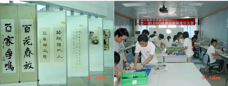 本届机电技能节的另一个特色就是体现高校浓厚的文化氛围和学生社团丰富多彩的校园活动。本院自上学期启动“百花工程”系列活动以来,在学校各级领导的支持下,通过不懈的努力已经将“百花工程”建成了我院非常有特色并在全校有一定影响力的品牌活动。“百花工程”系列活动之一的书法绘画摄影大赛也在校庆期间举行,经过精心挑选的几十幅学生的书法绘画作品在行政楼一楼展出,获得了学校领导和参加校庆开幕仪式的各级领导的好评。充分体现了学校科技与文化并重,技术发展和人文素养同步提升的要求。